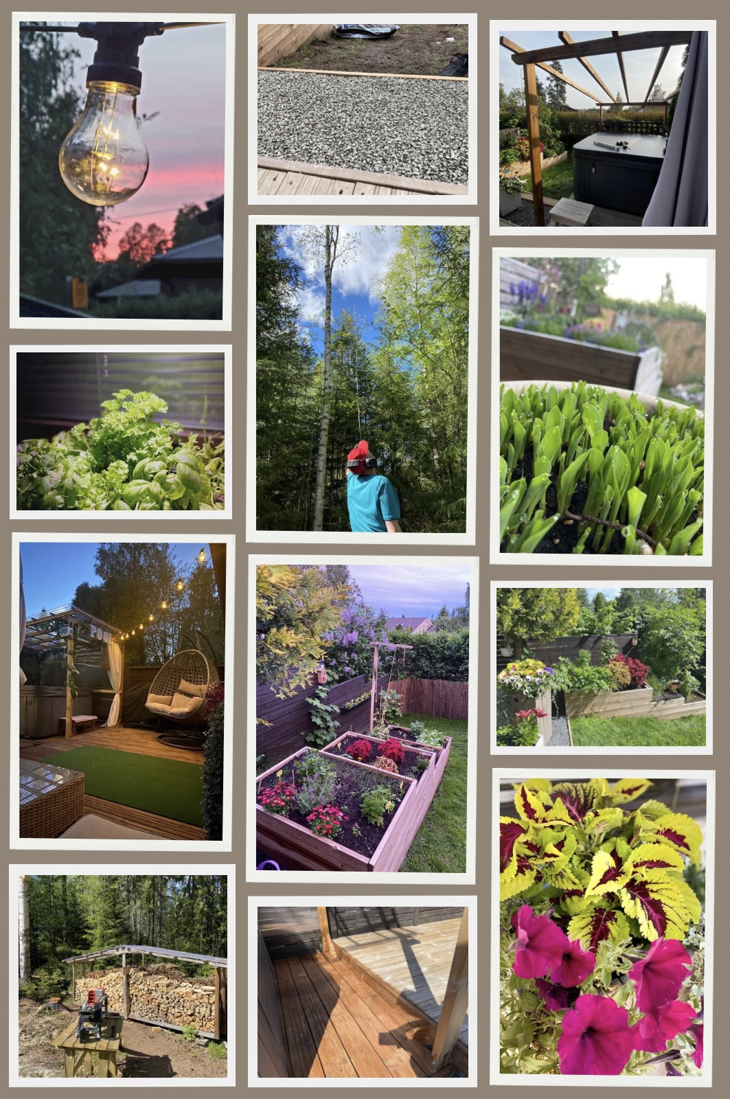 Rakastan kauniita ja viimeisteltyjä pihoja! Kasvatan hyötykasveja siemenestä tuotokseen saakka. Pihalla on valtavat, itse tehdyt kasvilaatikot täynnä mehevää kompostimultaa, jossa kasvaa kyllä melkein mikä vain. Mökillä puunkaadon jälkeen klapit kuivumaan seuraavaan vuoteen. Omalla pihalla puuterassi ja porealtaalla pergola valokatteella. Talvisin kasvilampun alla kasvavat tuoreet yrtit. Uusimpina kokeiluina ananaskirsikka sekä popcorn. Otoksia voit ihailla alla olevasta kollaasista 🙂