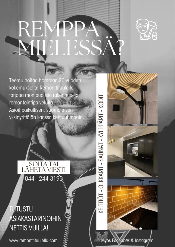 Minä olen Teemu ja tämä on minun tarinani Remonttituulella-yrittäjäksi. Kaikki alkoi 90 -luvun taitteessa isoisäni verstaalla, jossa sain jo pikkupoikana osallistua nikkarointiin sekä monenlaisiin korjaustöihin. Olen ollut mukana rakentamassa perheemme kesämökkiä ja osallistunut jopa isäni ralliautonkorjaustöihin. Isoäitini on kertonut, että olen pienestä pitäen ollut kiinnostunut kaikesta korjattavasta ja kunnostettavasta. Tämän vuosituhannen alkupuolella minulle tarjoutui mahdollisuus päästä ammattilaisen opissa rakennusalalle. Sen jälkeen en ole voinut kuvitellakaan tekeväni mitään muuta työtä. Olen asentanut lukemattoman määrän lattioita ja ovia karmeineen, laatoittanut kylpyhuoneita, asentanut keittiöitä, tehnyt väliseiniä ja ulkoterasseja, tasoittanut ja maalannut. Parasta työssäni on, että jokaisen työn lopputulos on ainutkertainen. Voin aidosti olla ylpeä työstäni ja asiakkaani ovat vuodesta toiseen tyytyväisiä lopputulokseen ja työni laatuun. Teen jokaisen asiakkaani remontit kuin tekisin niitä itselleni. Olen suomalainen työmies, jolla on sydän paikallaan juuri sinulle. Olen aina remonttituulella!